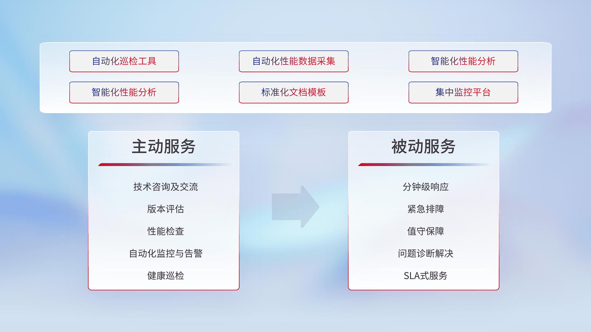 智能化工具和标准化文档,,,保障服务质量,,,,提供主动服务(包含技术咨询、、版本评估、、性能检查、、、、自动化监控与告警、、、健康巡检)和被动服务包含(分钟级响应、、紧急排障、、值守保障、、问题诊断解决、、、、SLA服务)。。。。